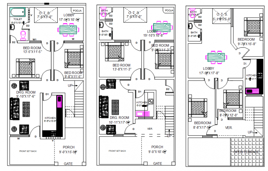 2D cad drawing of residence layout plan of ground floor with 2 different options and first floor along with all furniture detail, dimension detail and description detail in autocad format, download in a free cad file and get more detail about the residence house project.