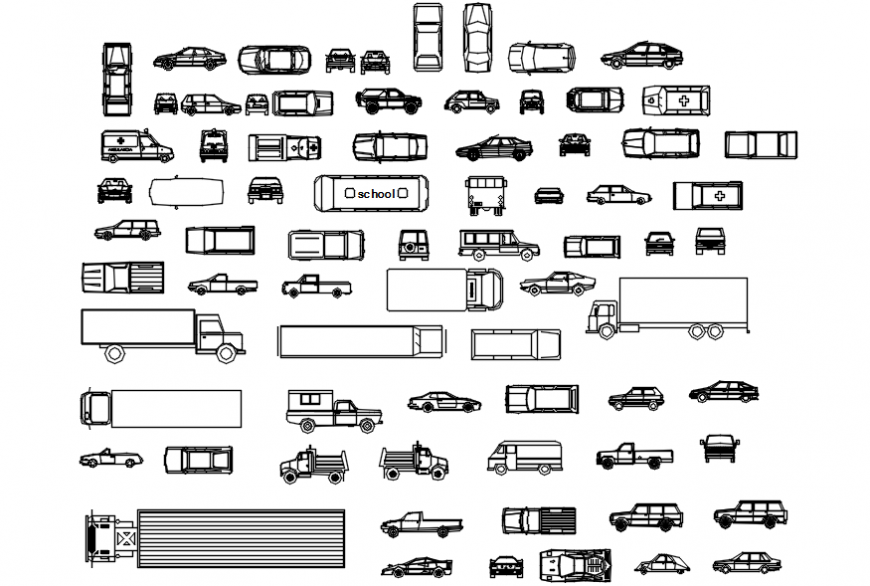 Vehicles model 2d block detailing. here there is 2d top and front view of vehicles of truck, car, lorry , bikes . their eleavtion model and plan view is shown in autocad format