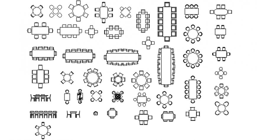 Dining table cad blocks top view . Designer chair and table designs with various sizes and shapes detailing with different types of seater details in 2d top view auto cad format