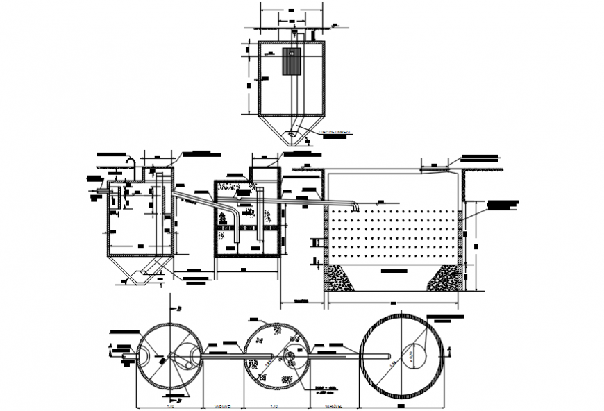Plumbing 2d sectional detail file. here there is sectional detail of a water tank and its piping details with dimensions and text detailing in auto cad format