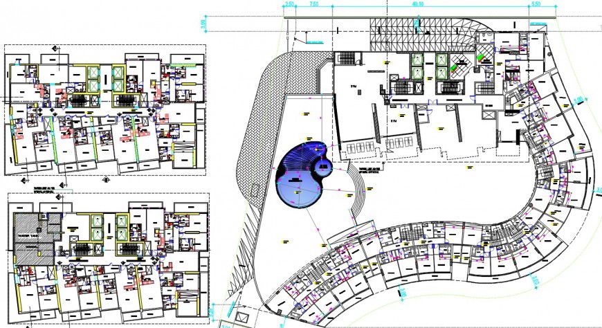 find an architectuire layout plan of apartment multifamily residence includes 2 and 3 BHK with furniture detail, dimension detail and description detail also have a swimming pool, parking area and many more detailing in cad file, download in a free apartment autocad software file.