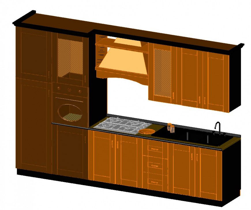 3d model of wooden kitchen design cad file shows that cupboard, chimney, 4 burner stove, drawer and many more detailing in cad file.