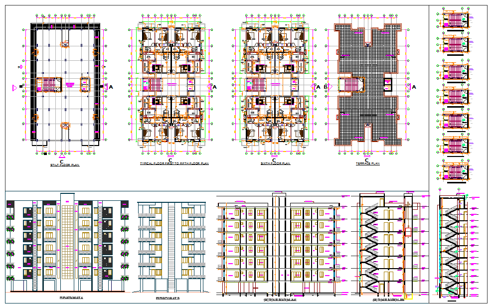 The architecture layout plan of 2 BHK apartment, section plan and 2d elevation design of Apartment Building plan. High Rise Apartment Project DWG File, High Rise Apartment Project Download file.