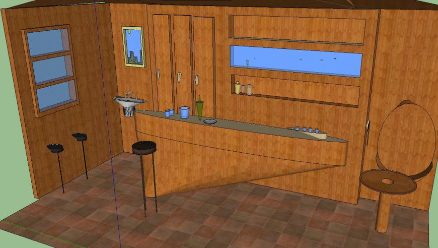 3d model of bar design includes a seating chair, bear botels, and many more blocks use in skp file for improving the presentation in a sketch up file.