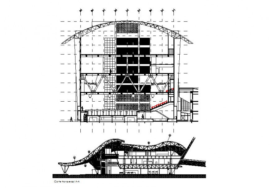 Airport terminal view sectional detail. Here there is 2d sectional elevation of a airport interior detail with walkway and exterior concept