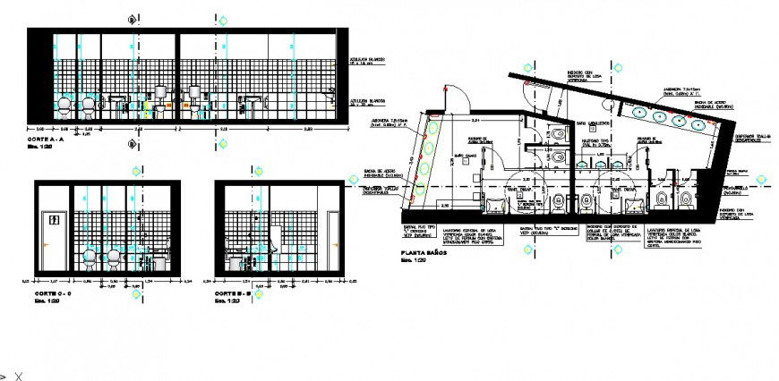 Bathroom front elevation details,here there is 2d detailing of bathroom, its sectional details are shown with tiles and faucets details and top view plan of bathroom with wc and door detailing