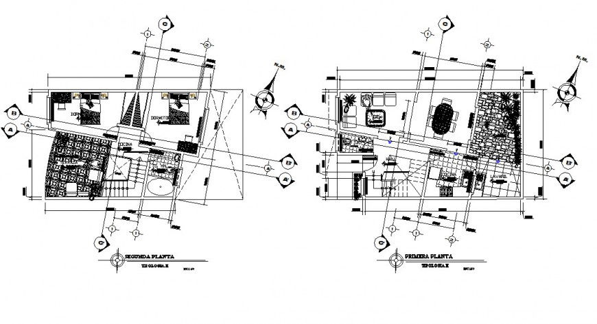 Multi floor bungalow architecture plan.here there is top view layout plan of a house,containing furniture details,sofa, dining, plantation of both the floor detail