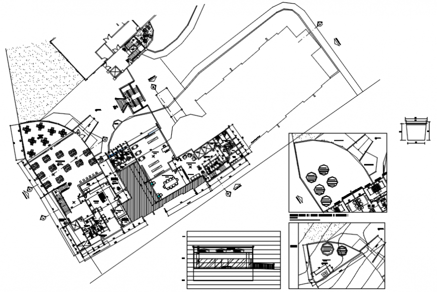 Architectural hotel plan in AutoCAD software plan include detail of area distribution and circulation of area with entry way reception rea and view of pool dining area customer room garden and parking area in plan and road area and door position.