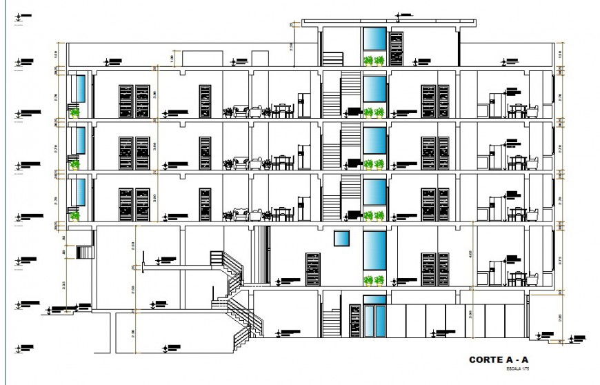 Interior concept of building model. Multi family housing project 2d elevation dwg file. Here there is 2d elevation details with sectional detailing of all sides. Complete interior detail is also shown with human figure detailing in auto cad format