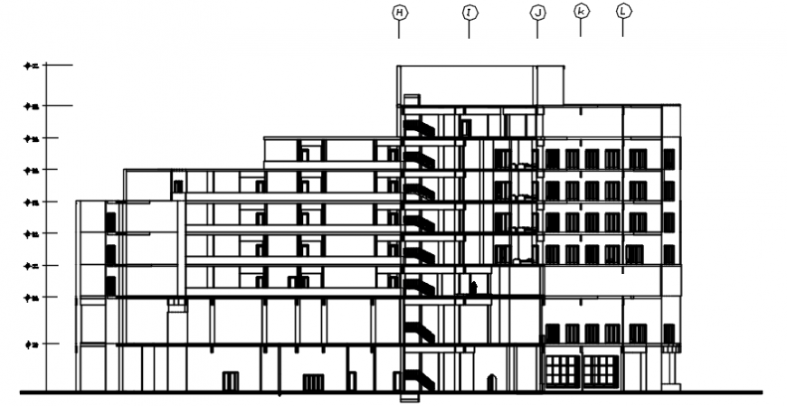Autocad file of a hotel building section showing all the details including staircase, door and window details, each floor height, center line, inner furniture, etc.