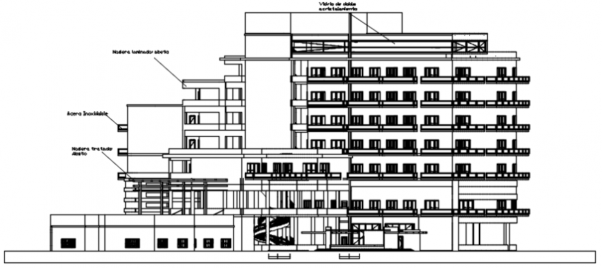 Autocad file showing elevation of a hotel with all the details including window details, balcony projections, area specification, window details, elevation treatment details, pergolas details, etc.