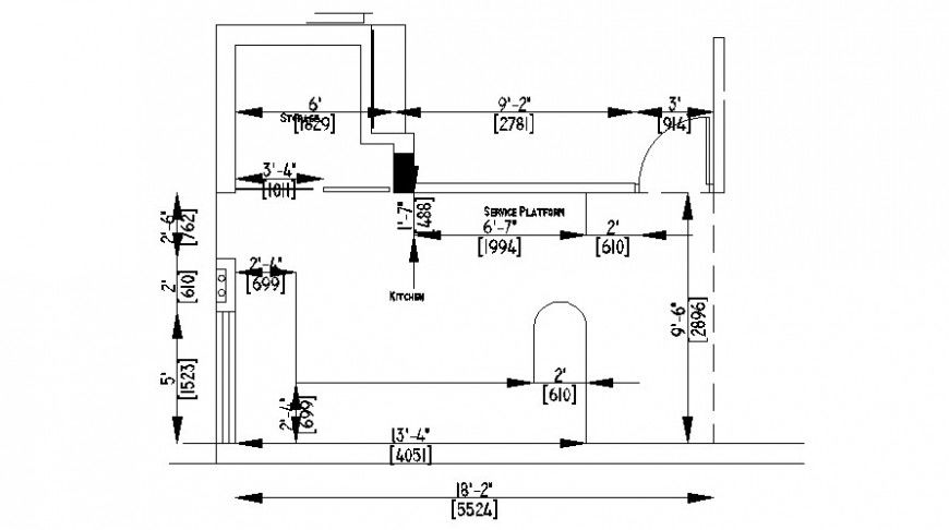 Plan of kitchen in AutoCAD file plan include kitchen area distribution and wall window and door position kitchen platform and circulation area and distance of kitchen service area and storage and important dimension.