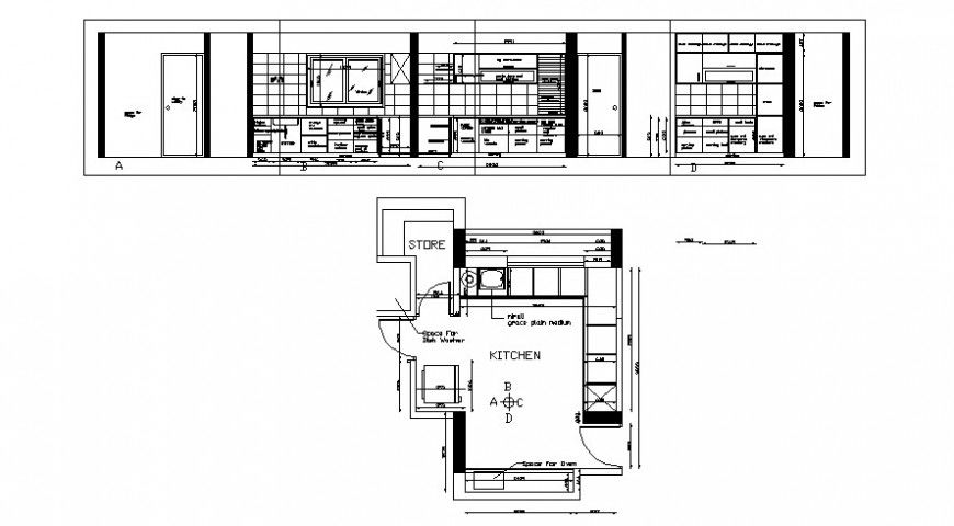 Kitchen plan and elevation in AutoCAD file plan include detail of wall and area distribution window and door area and view of platform of kitchen with stove and sink area,elevation include detail of kitchen height door of platform drawer and desk area with important dimension of file.