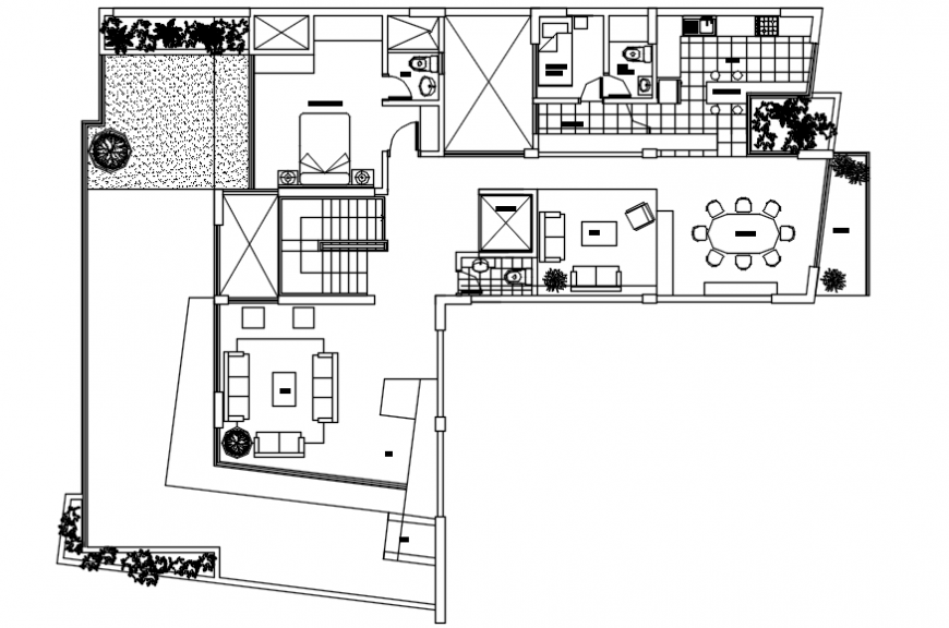 Autocad file showing floor plan of a house with details like furniture layout, circulation space, area specification, landscape, plantation, etc.