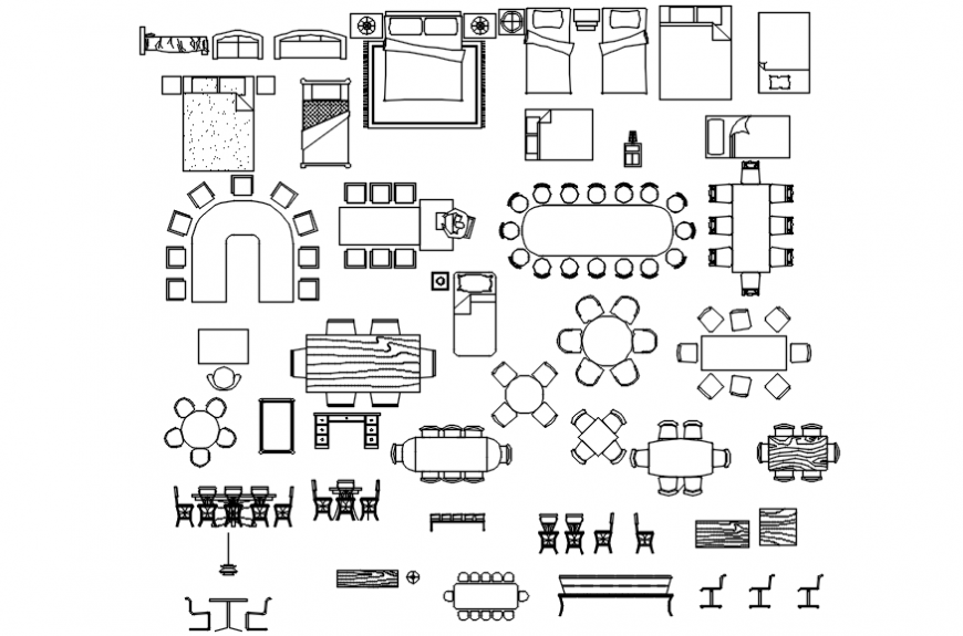 Autocad drawing of furniture block plan including residential furniture like different types of dining table, double bed and single bed, conference tables, side and study tables, etc.