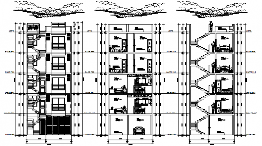 Autocad drawing of multi-family house sections showing all the details including wall thickness, furniture, space specification, dimensions, door-window opening, etc.