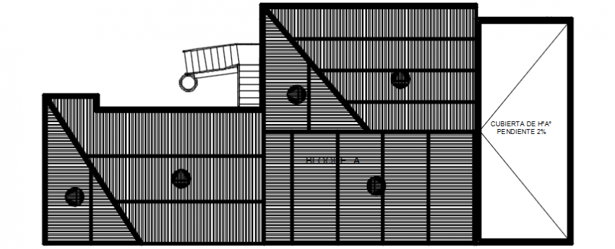 Autocad drawing of residential building roof plan showing material description and slopes of roof.