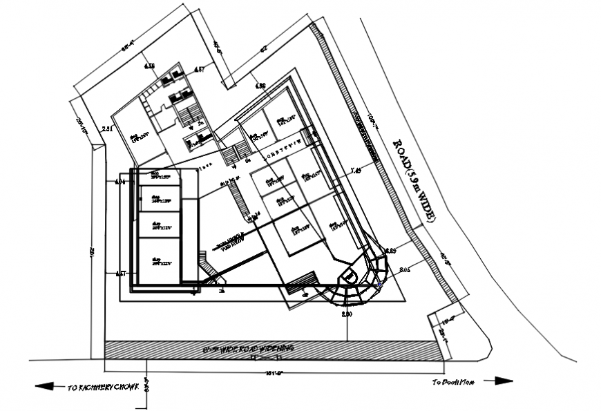 Autocad drawing of commercial project showing ground floor plan with details like area specification, adjacent roads and their respective widths, pathways, etc.