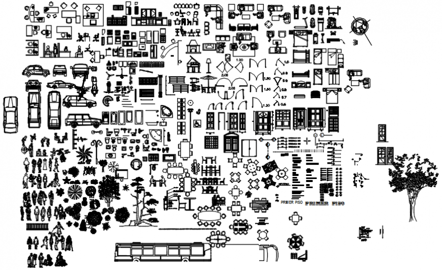 Autocad drawing of furniture block showing all types of furniture in plan and elevation like cars, dining tables, sofa, bus, etc.