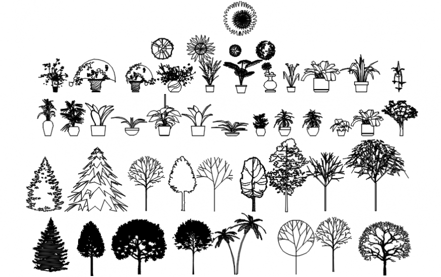 Autocad drawing of trees and plants cad block having different types of trees in plan and elevations.