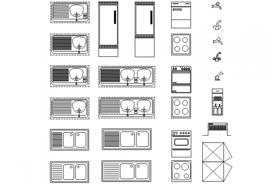 Kitchen utility cad blocks file. here there is top view 2d plan detail of various wash basin designs and fridge detailing concept in auto cad format