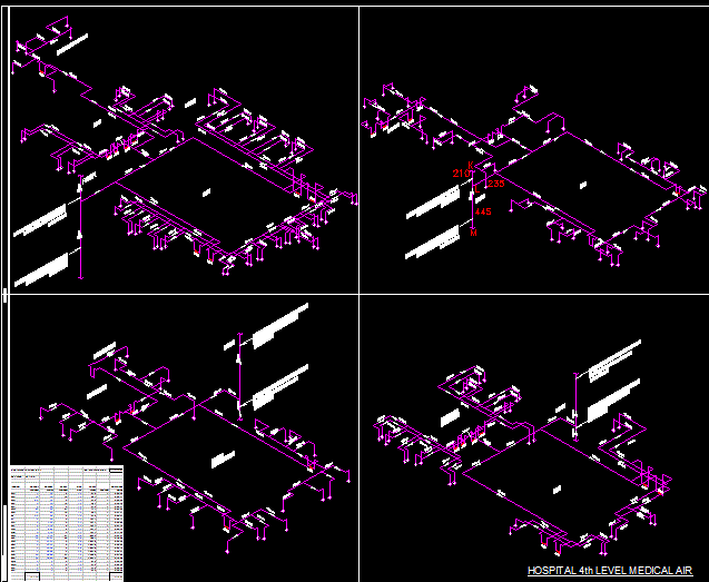 The Medical Air Pipeline Hospital DWG CAD drawing file provides a detailed isometric diagram of a medical gas pipeline system designed specifically for hospital use. This technical drawing illustrates the complete network of medical air, oxygen, vacuum, and nitrous oxide lines distributed throughout the facility. Each pipeline is clearly labeled, showing connection points, flow direction, and pressure zones to ensure proper installation and system efficiency.