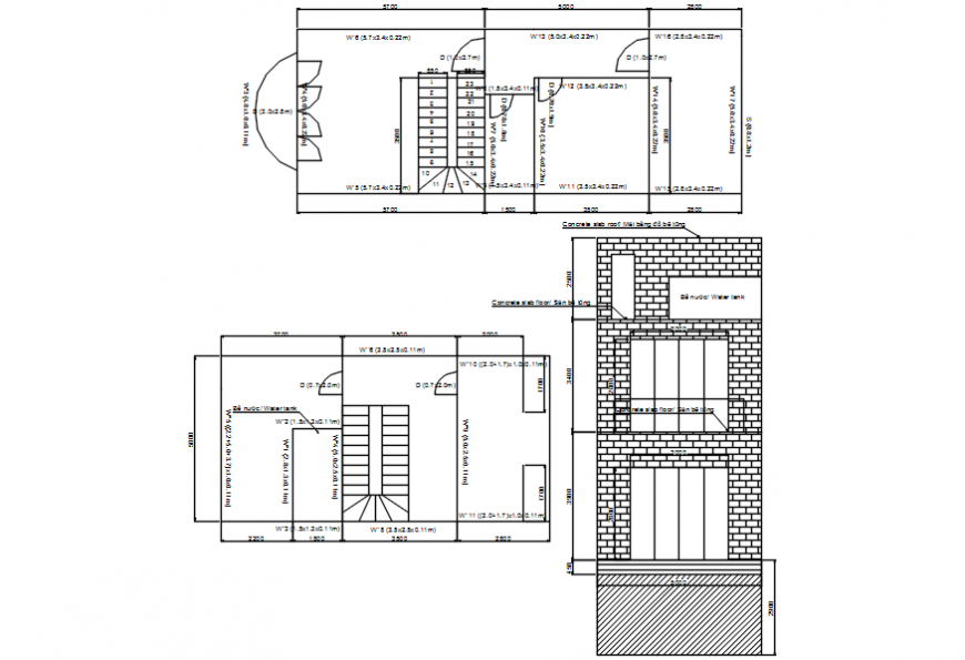 Autocad drawing of house plan layout and front elevation showing all the required details including details of room dimensions, staircase cabin, material hatching, door-window openings with dimensions, etc.
