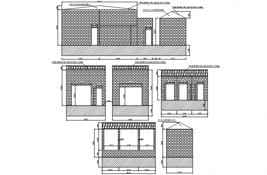 Autocad drawing of house elevations from differnet sides with all the required details like door-window openings, exposed brick work in elevations, etc.