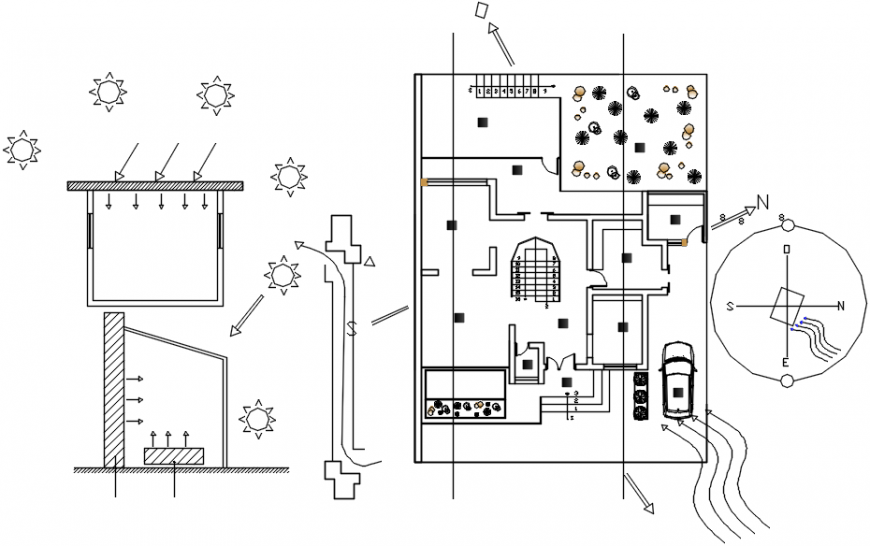Sectional detail of bungalow . here there is top view sectional detail of bungalow showing staircase design with caar parking area and other details in auto cad format