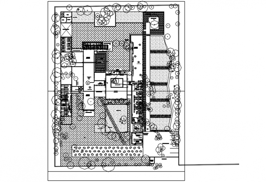 Landscaping top view plan detail. here there is top view plan of public garden showing flooring stone concept and bushes and garden detailing in auto cad format