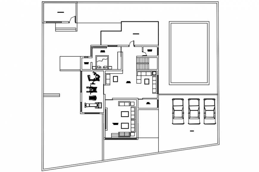 Modern house top view plan. here there is top view house plan showing living area details, gym concept design, car parking area and bedroom furniture detailing