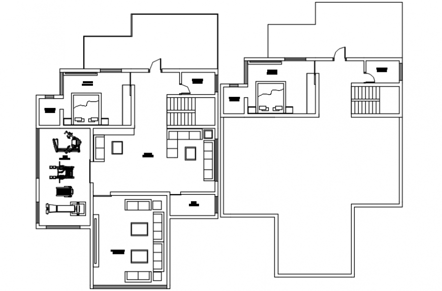 Modern house top view plan. here there is top view house plan showing living area details, gym concept design, car parking area and bedroom furniture detailing