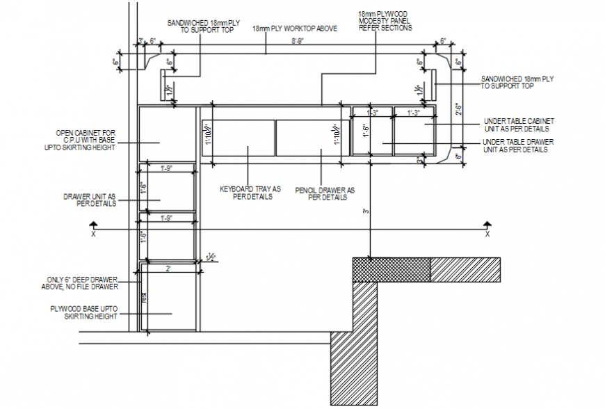 Office furniture detailing 2d.here there is top view model detail of a furniture, showing cpu cabinet detail, upper drawer detailing in auto cad format