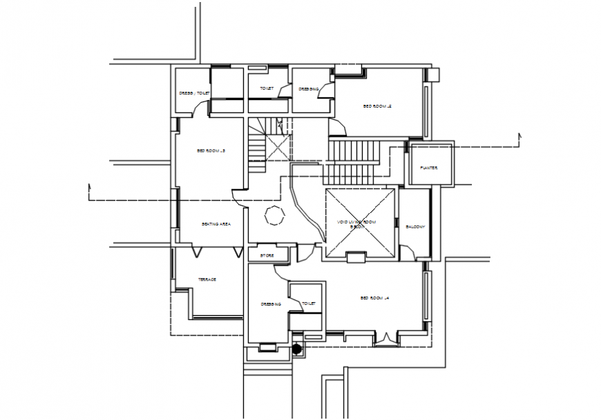 Spacing concept of house. here there is top view layout plan of spacing concept of apartment in 2d in auto cad format