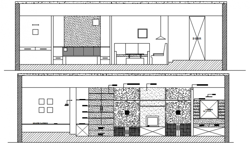 Interior sectional furniture detailing . here there is sectional detail of hall with sofa , and tv unit detail and exterior view of hall with all interior details