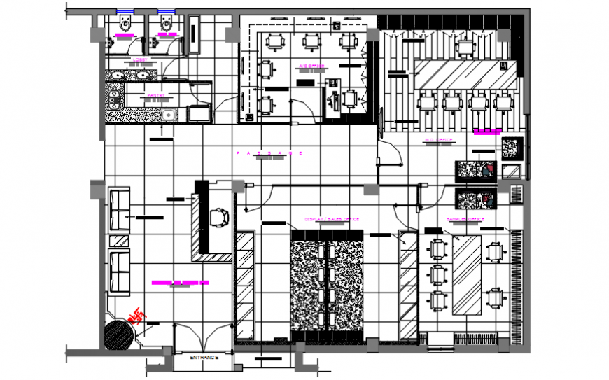 top view layout plan of a office dwg file, here there is top view 2d layout plan of office, containing meeting room, pantry, offices, cabins, terrace detailing etc