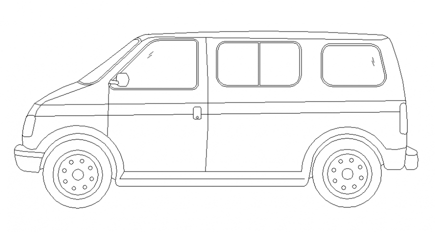 Van side view detail. here there is side view detail of model with tier and window and exterior view detail in auto cad format