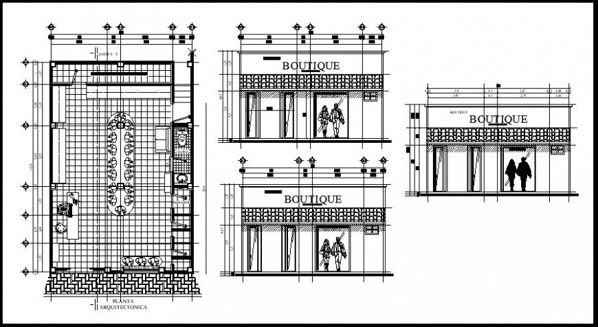 Boutique elevation and layout. here there is 2d elevation of a shop with its exterior view detail and its interior project design in auto cad format