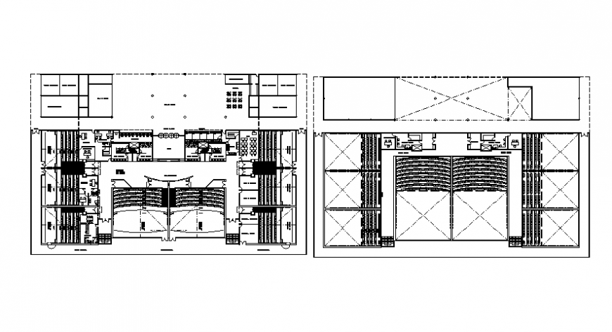 Auditorium furniture layout and elevation plan. here there is a top view layout plan of a auditorium with furniture detail plan and other sectional details