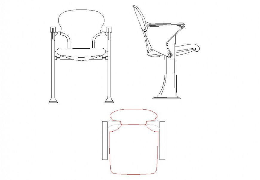 Salon chair elevation details file. here there is front and side elevations of a salon chair. it also contains top view of the chair in 2d auto cad format