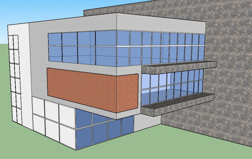 3D elevation of a office. Here there is 3d file showing elevation detail of office with isometric view and glass detailing with stone design and complete exterior view is shown