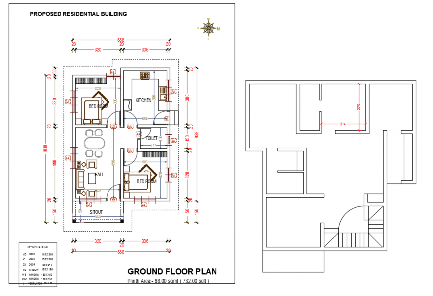 Ground Floor Furniture Lay-out design, All Door & Window Detail type of Short name mansion & Size detail.Plinth Area:- 68.00 sqmt ( 732.00 sqft ) ,.