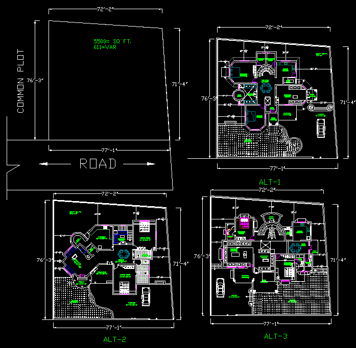 77'X71' Three different types of double bedroom bungalow House plan AutoCAD DWG file. In all three plans building area is the same, room allocation and room sizes vary. In all plans master bedroom with attached toilet, Kid's bedroom, Drawing room, puja room, Kitchen, Dining, TV Lounge, Car parking, porch, and Lawn are available. The Staircase is placed inside of the house.