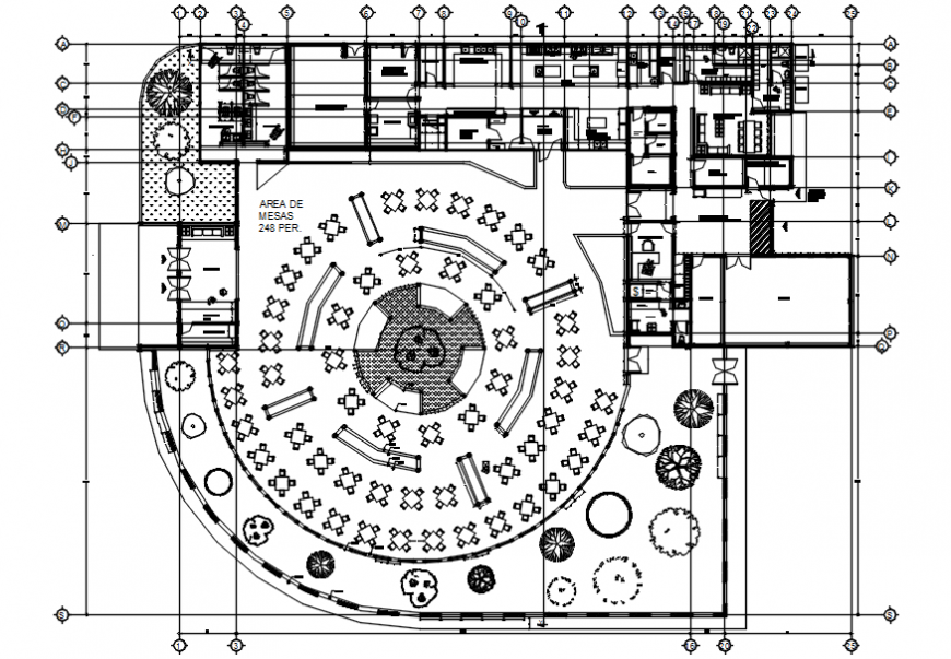 Hotel main plan in AutoCAD file its plan include area distribution garden area entry way reception area washing area and hall center area with dining area with dining table and chair in design with room area in view.