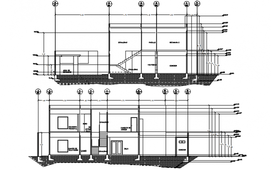Residence building elevation in AutoCAD file include detail of wall and wall support floor and floor area and designer door and column main entrance with designer tile on roof of house with stair support and slab with necessary dimension.