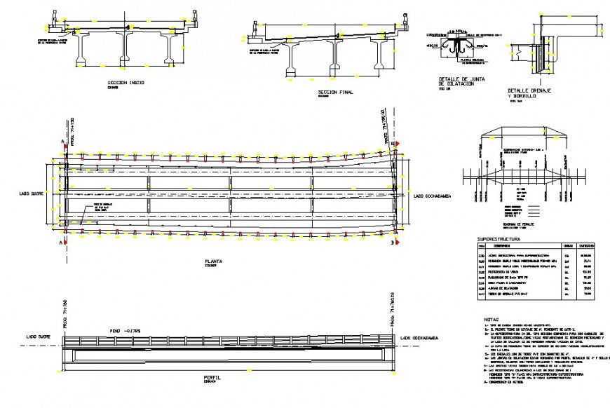 Road and bridge construction project detailing . here there is front and sectional elevation detail of bridge with text and sections and table format detailing