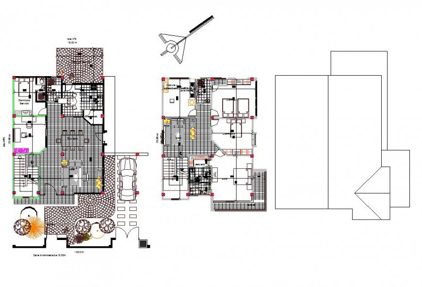Bungalow top view architecture plan.here there is top view layout plan of a house,containing furniture details,sofa, dining, plantation etc