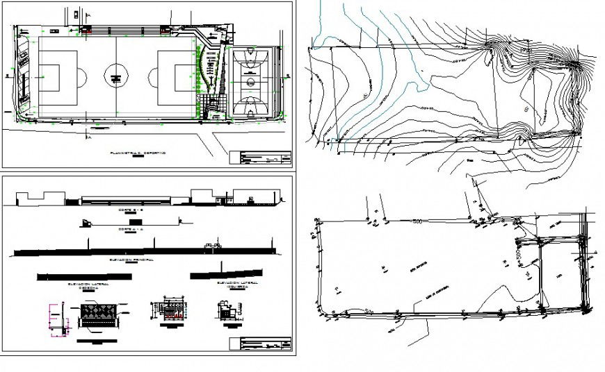 Sports complex elevation model.Sports centre elevation model. here there is exterior concept of building with top view plan of a court area with all sides of elevation detail
