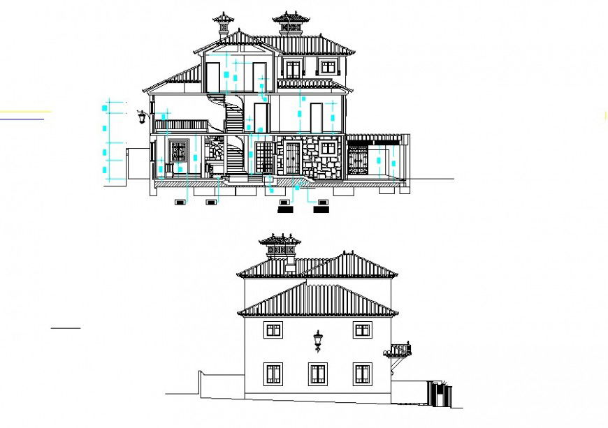 Traditional concept of bungalow design. Front elevation detail of a house interior dwg file, entrance design of a house, pillar design, big and luxurious design concept details