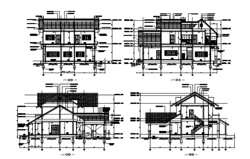 Dwg file of house 2d detail which includes a section of the house with details of centerlines, roof, relling, levels, and also includes construction details etc.